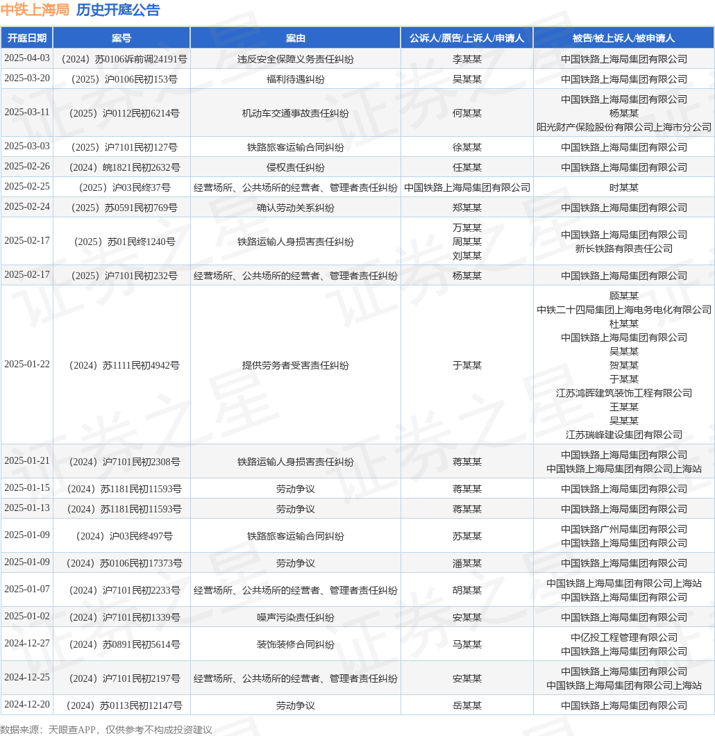 本站消息,根据天眼查APP显示,近日公布了一则中国铁路上海局集团有限公司作为被告/被上诉人的开庭公告,详细内容如下: